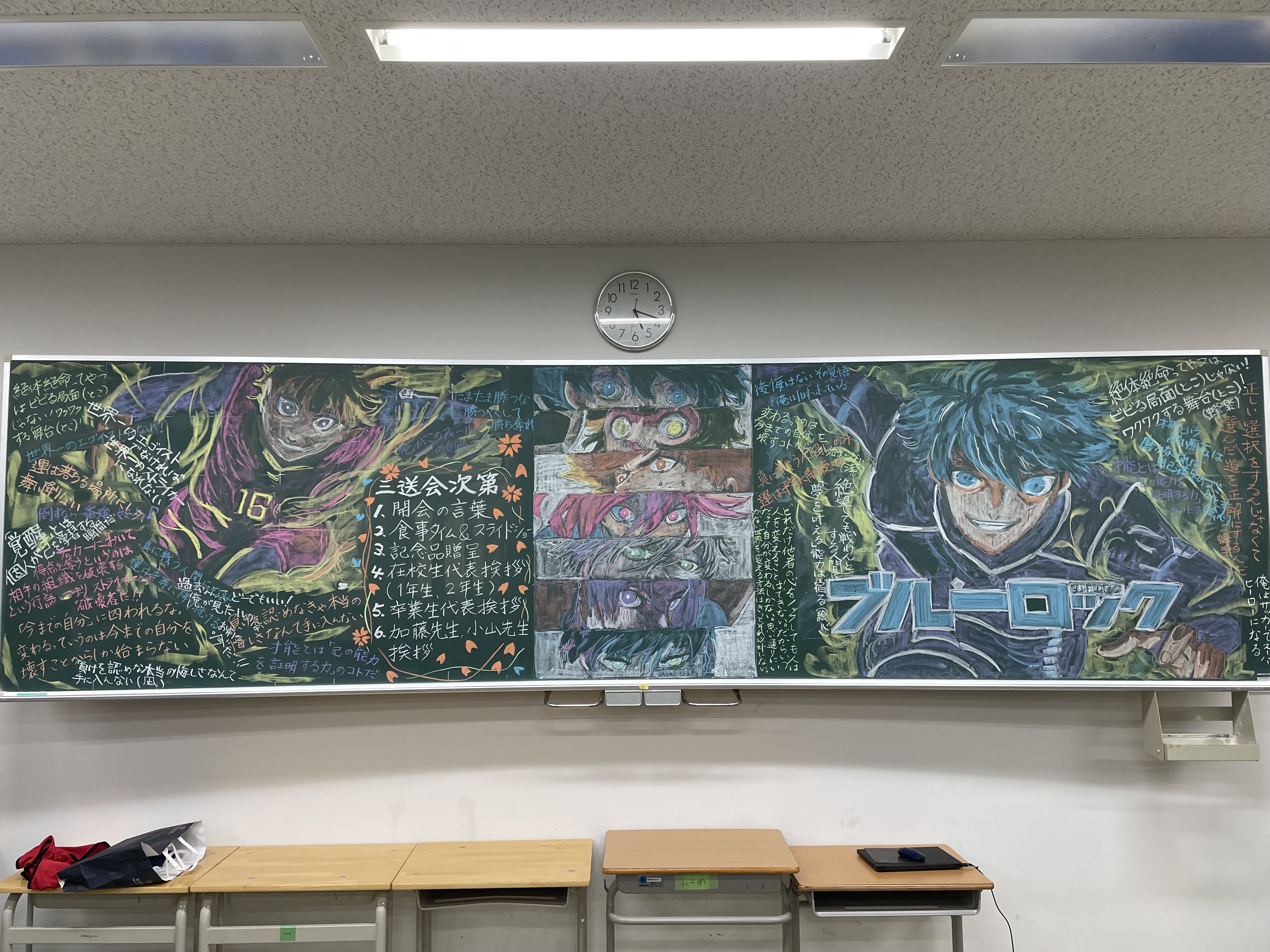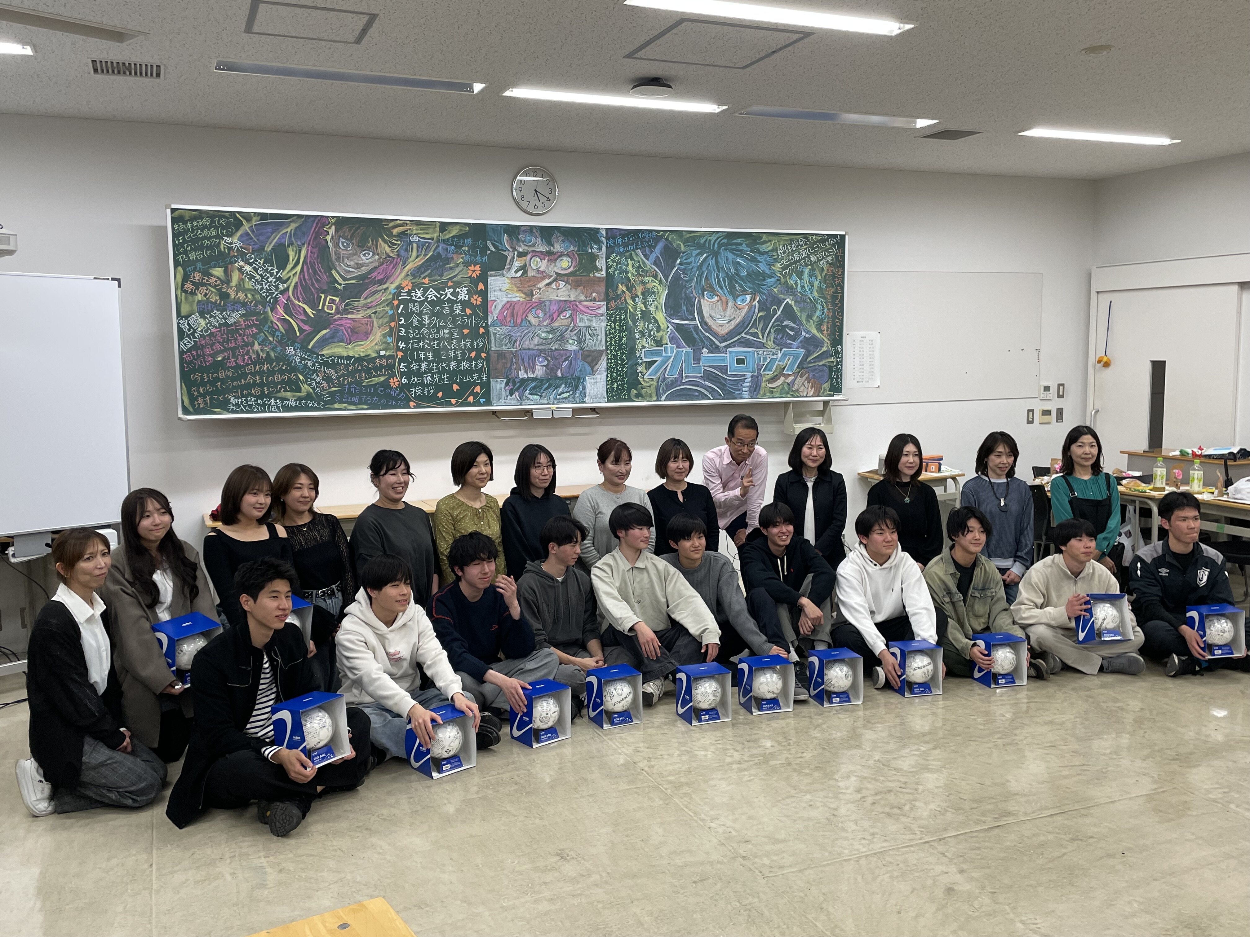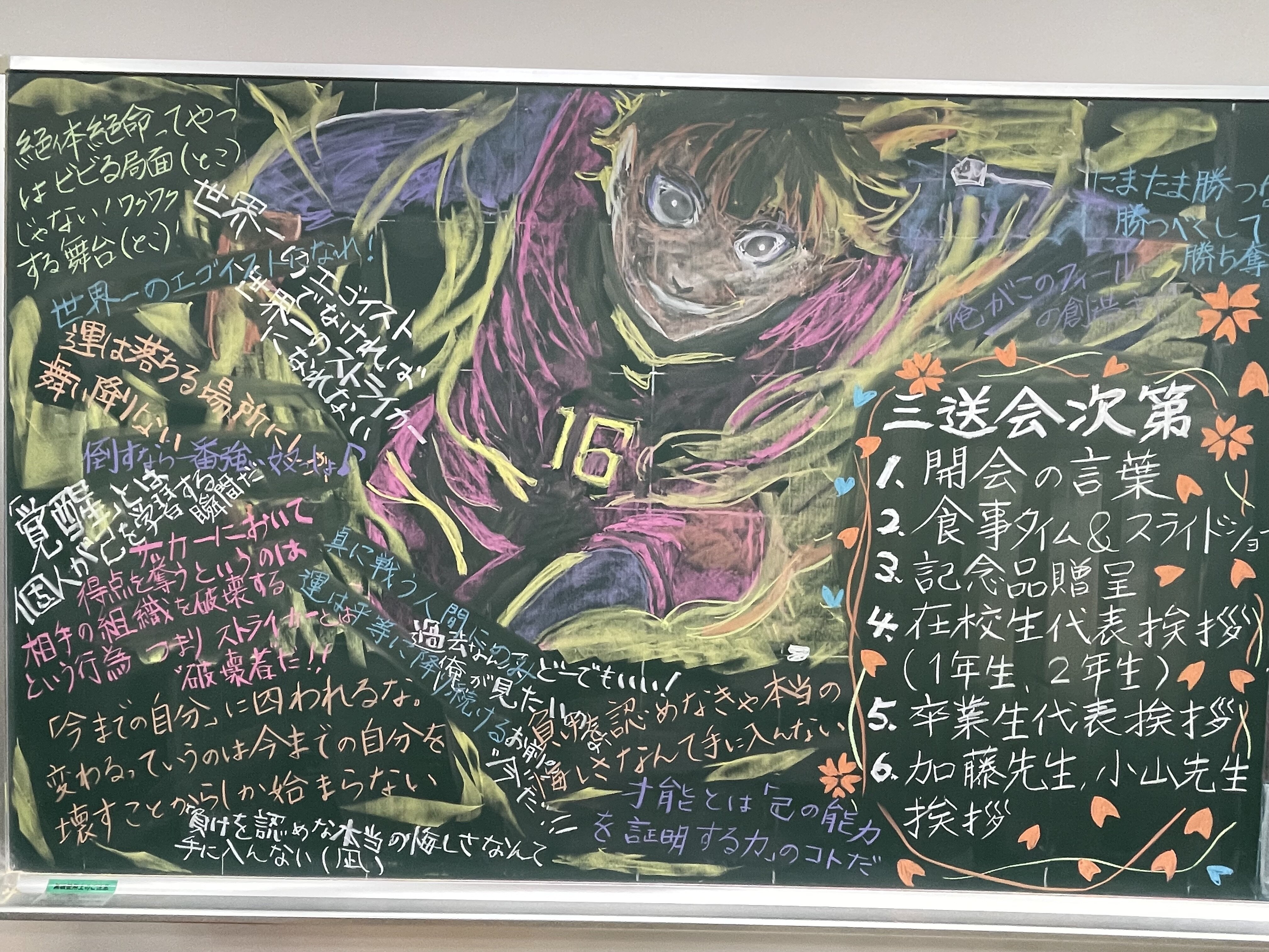 3月21日三送会を中大高校にて行いました。卒業生部員11名とマネージャー2名を1,2年と保護者、顧問全員で送り出しました。最初に文京三中で試合を行い、その後学校に移動して、食事会になりました。和やかな雰囲気の中、卒業生一人ひとりに言葉をもらいましたが、それぞれの言葉の中に三年間の思いが込められていて聞いていて心にじんとくるシーンが多々ありました。保護者の方々にも協力していただき、食事やお菓子の準備から始まり、会場の座席のレイアウトまでお膳立てしていただきました。また、卒業生の保護者の方の好意で会場の黒板に素晴らしいイラストの黒板アートを描いていただき、その完成度は終了後も消すのが惜しくなる程見事なものでした。このアートのみならず現役時代の保護者の方々の並々ならぬ力添えには感謝が尽きません。卒業した部員とマネージャーの皆が今後も活躍してくれることを願うとともに、保護者の皆さまの三年間に協力と援助にあらためてお礼を申し上げます。